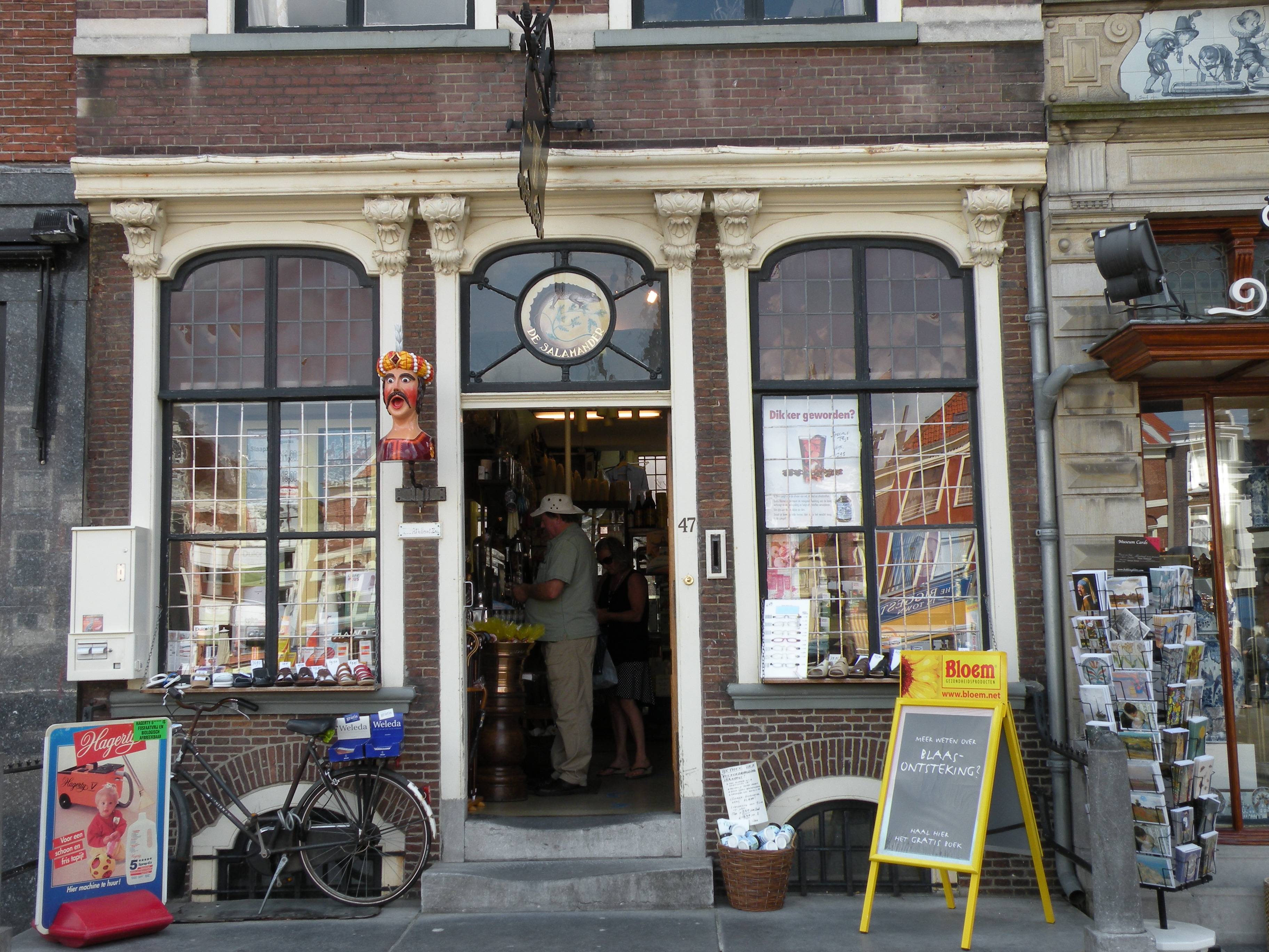 Het hoekpand Oude Delft/ Binnenwatersloot kreeg in 1892 een nieuwe, rijk gedecoreerde, winkelpui. Deze was tot voor kort geschilderd in een zeer donkerbruine, bijna zwarte kleur, die alle details doodsloeg tot een amorf geheel. De gevel als geheel heeft een nieuwe kleurenschema gekregen met als meest opvallende een lichte karamelbruine tint voor de pui, en geelbruine accenten voor details zoals de hangende granaatappel boven de hoekentree. Olijfgroene kozijnen en cremekleurig pleisterwerk contrasteren mooi ermee. Door de nieuwe kleuren is het weer een beeldbepalend hoekpand, en zijn de vele puidetails haarscherp zichtbaar.